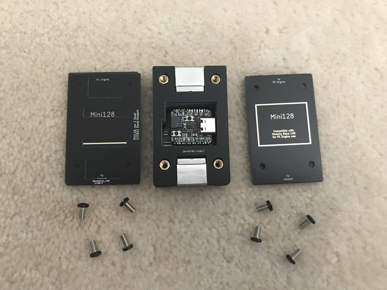 - 하단 = 1 레이어, 1.6mm 두께, "PCE128_Rev_C_Face"의 ENIG 보드(뒷면이 밖으로 향함)