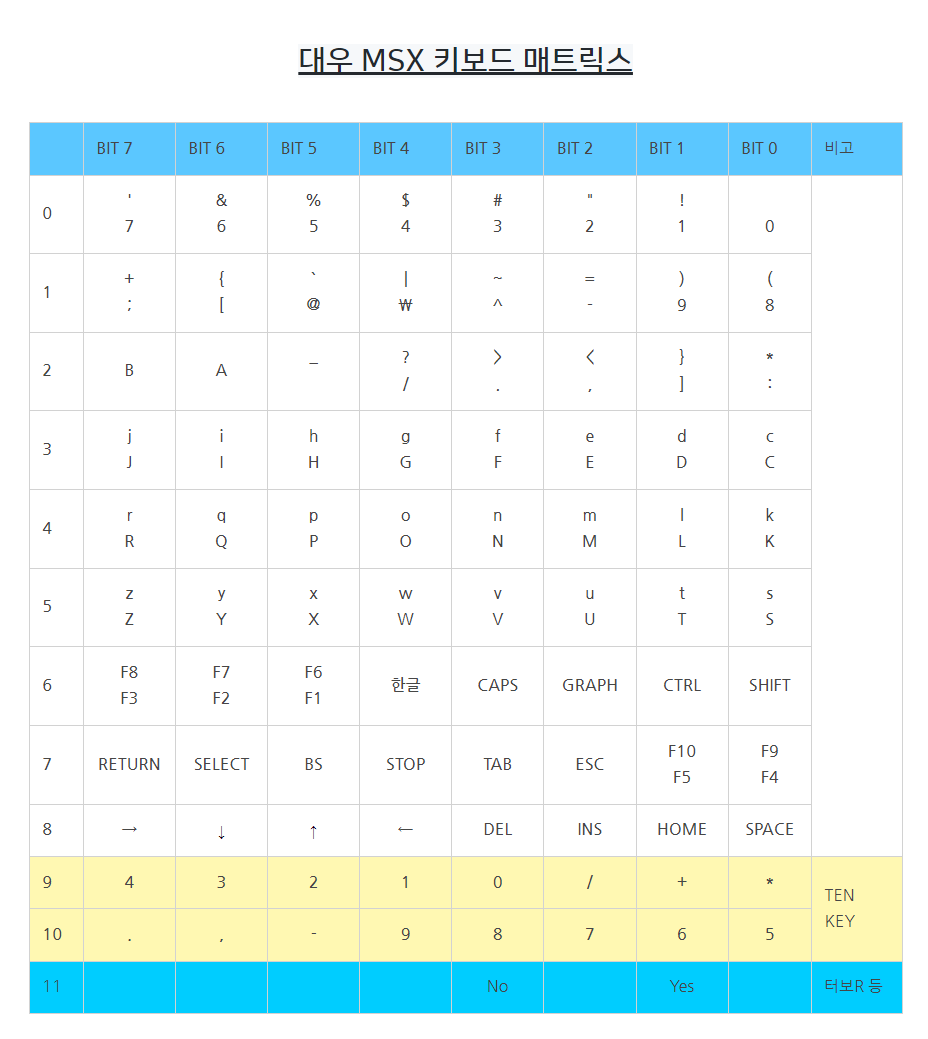 대우 MSX 키보드 매트릭스 : https://blog.naver.com/jsfx3/222011871680