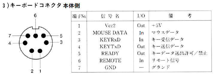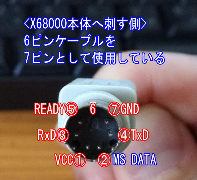 원래의 키보드 커넥터는 7핀이지만 6번째 핀의 REMOTE는 이 변환기에서는 사용하고 있지 않기 때문에 Mini DIN 6핀 케이블을 가공해 사용할 수 있습니다. 중앙에 있는 플라스틱 돌기를 니퍼 등으로 절단해 버리면 본체의 7핀 단자에 끼울 수 있습니다.
