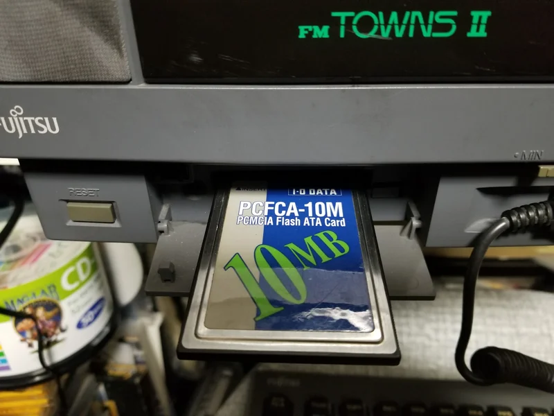 무엇으로 붙어 있었는지 하면, IC메모리 카드(PCMCIA라고 부르고 있었지요?오래된 노트북이면 반드시 이 규격의 카드 슬롯이 붙어 있던 것입니다)를 FM TOWNS로 HDD로서 이용할 수 있도록(듯이) 하고 싶었습니다만, 이것이 할 수 없었습니다…