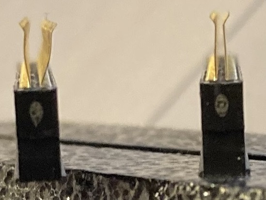 평소 사용하고 있는 PCB 제작 서비스 OSH Park에서는, 1.6 mm, 0.8 mm, 0.2 mm 중에서 하나밖에 선택할 수 없다. 0.2mm는 플렉스 기판이라는 것으로, 납땜은 가능하지만 실제로 사용하기에는 좀 무리가 있다. 그렇다면 핀을 구부릴 수밖에 없다. 1.27mm 간격의 핀이 모두 평행인 채로 구부리려면 어떻게 하면 좋을까? 흐흠, (일단은) 기계공학 박사인 나를 우습게 보면 곤란하지! 라고 말하면서, 다음 그림과 같이 먼저 얇은 구리판을 사용하여 한쪽 핀을 바깥쪽으로 구부린다. 여기까지는 간단. 하지만, 핀의 끝이 기판에 닿지 않으면 납땜할 수 없기 때문에, 이번에는 직경 1 mm의 철사를 핀과 핀의 사이에 끼우고, 지렛대의 원리로 나란히 구부린다.
