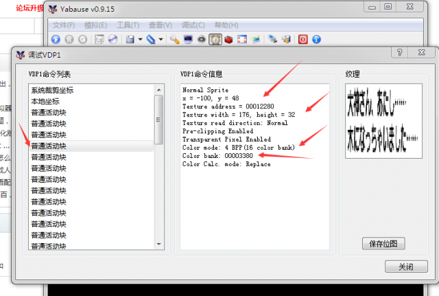 vdp1의 왼쪽 창 인터페이스에서, 우리는 다른 활성 블록을 차례로 훑어본 다음, 그 중에서 텍스트를 나타내는 활성 블록을 찾습니다. 주의하십시오. 구체적인 활동 블록을 찾은 후, 중간의 vdp 명령 정보 창에 많은 매개변수를 기록해야 합니다. Texture address : 이 이미지 데이터는 vdp1에 있는 주소 12280 (vdp1부터 주소가 5c00000이므로 실제 주소는 5c0000+12280 = 5c12280)
