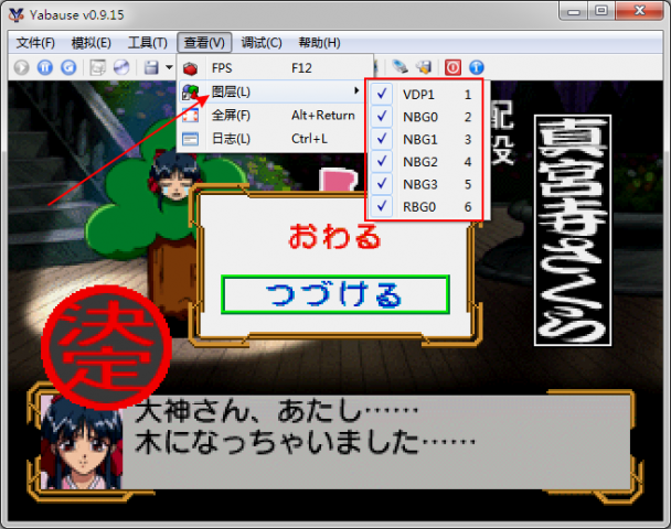 그래서 게임 화면에서 어떤 레이어를 켜거나 끄려고 시도합니다. 이 게임에서 키패드의 1버튼을 눌렀을 때 텍스트 레이어가 모두 사라졌기 때문에 텍스트 레이어가 VDP1 안에 있는 것을 확인할 수 있습니다.