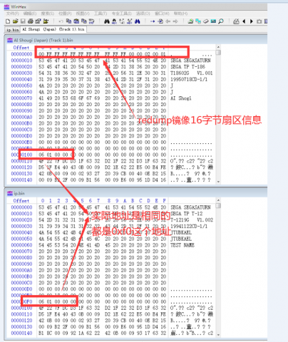 32kb 데이터를 메모리에 읽으면 첫 번째 동영상을 재생한 바이오스는 06002100이라는 곳, 즉 ip 파일의 0x100 주소로 건너뜁니다.(여기서 중점적으로 말하면, 여기의 주소는 redump와 같은 2352bin 형식이 아닌 2048의 ISO 형식의 주소를 가리킨다. bin 형식은 edcecc 검사를 포함하고 있기 때문에 실제로 2352bin 형식에는 2048바이트마다 304바이트 섹터 데이터가 포함되어 있으며, 이 2048바이트의 데이터가 올바른지 검사 및 수정하기 위해 사용됩니다. 그 중 16바이트 섹터 머리 데이터는 2048데이터의 머리 부분에 있고, 뒤에 남은 edcecc 검사 데이터는 끝에 있습니다. 아래 그림 보기)